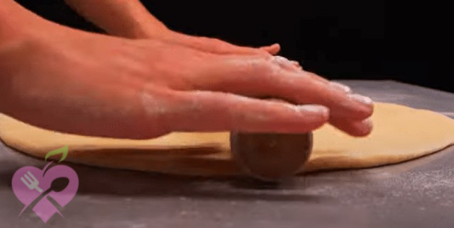 Потім наріжте їх на невеликі смужки і змастіть м’яким маслом. Звичайне тісто також розкачайте і наріжте на 8 однакових частин.