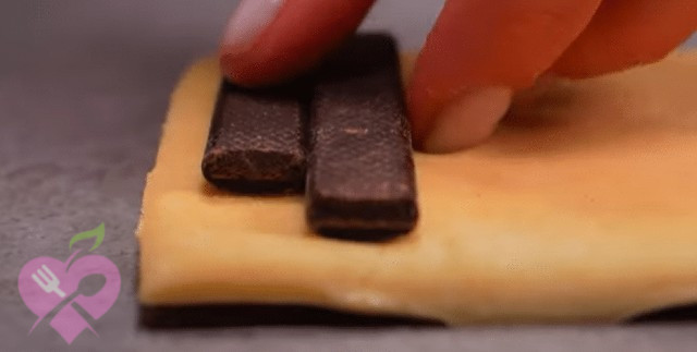 На тісто кладемо кілька шматочків гіркого шоколаду і починаємо скручувати.