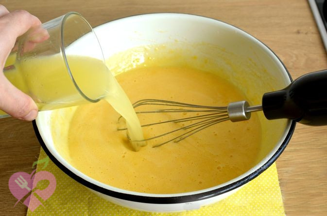 Для начинки яйця з’єднати з цукром і злегка збити вінчиком до однорідності. Додати лимонний сік, цедру і борошно, ретельно перемішати до гладкості без грудочок.