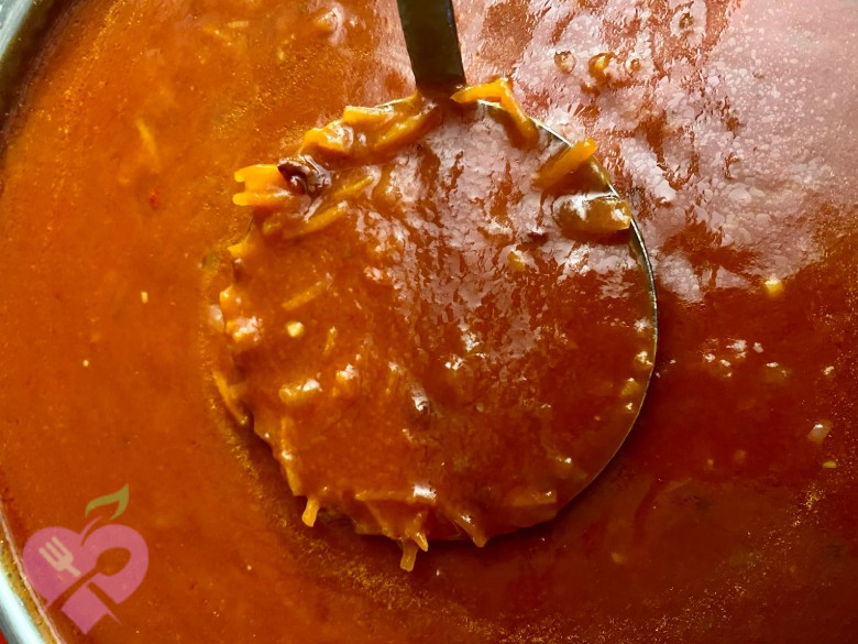 Готуємо спершу соус. Обсмажуємо на олії цибулю, моркву. Додаємо часник і смажимо ще 1 хвилину. Додаємо пасту, паприку, воду, сіль, цукор. Доводимо до кипіння і тушкуємо пару хвилин.