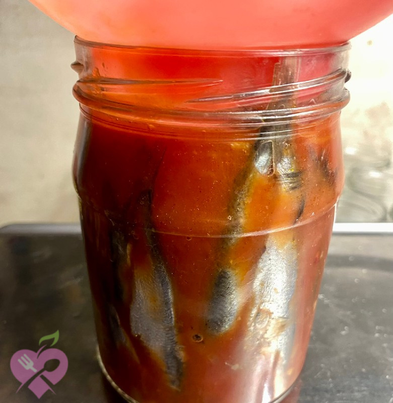 Наливаємо приблизно 100 мл соусу і акуратно укладаємо рибу головою вниз вертикально. Зручно трохи нахилити банку на бік і так укладати рибу.